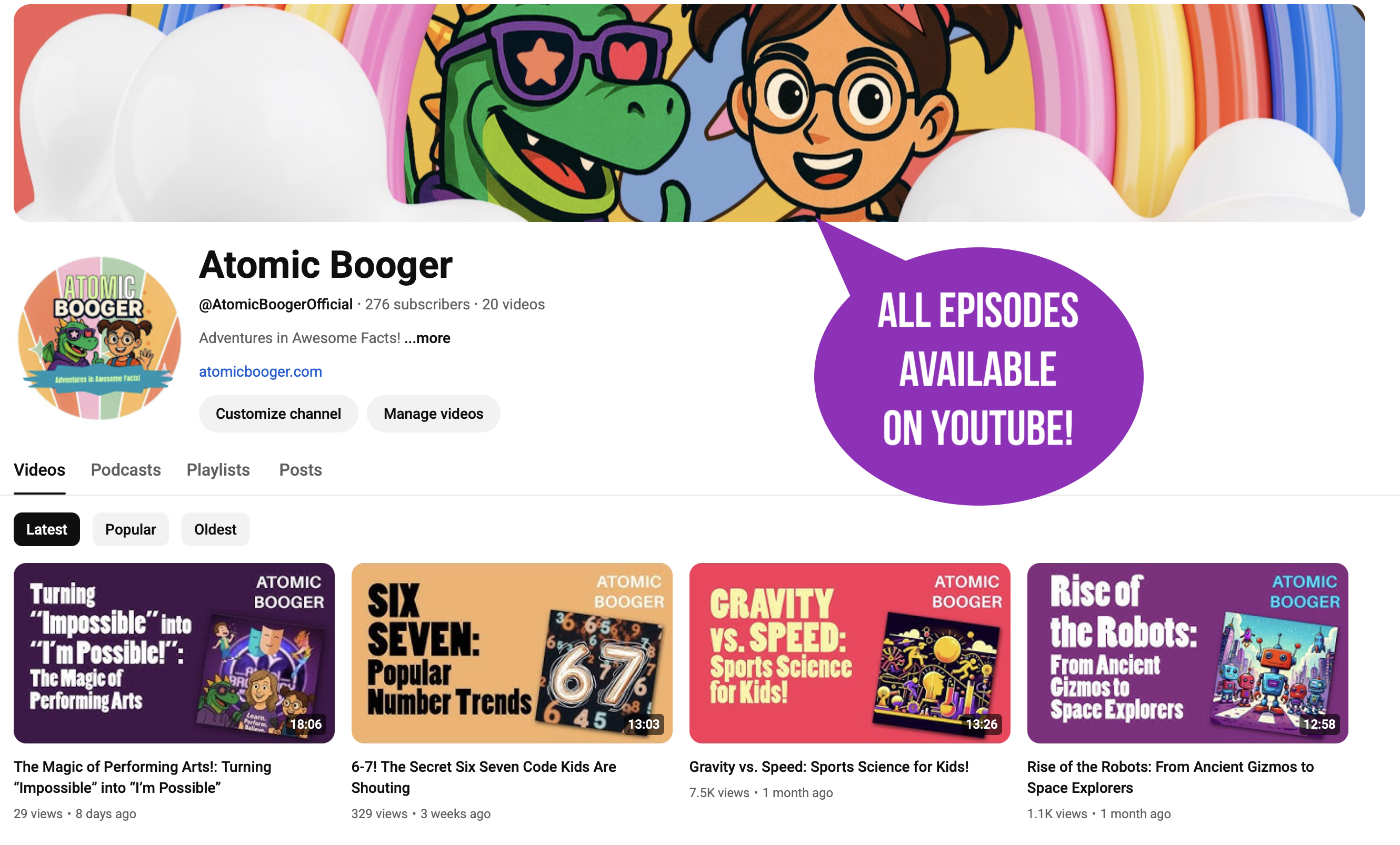 Perfect for curious kids ages 7–12, each episode delivers family-friendly facts, fun stories, jokes, and big adventures in learning. Whether you’re on a car ride, at home, or just love learning weird and wonderful things, Atomic Booger® is your ticket to being greater!